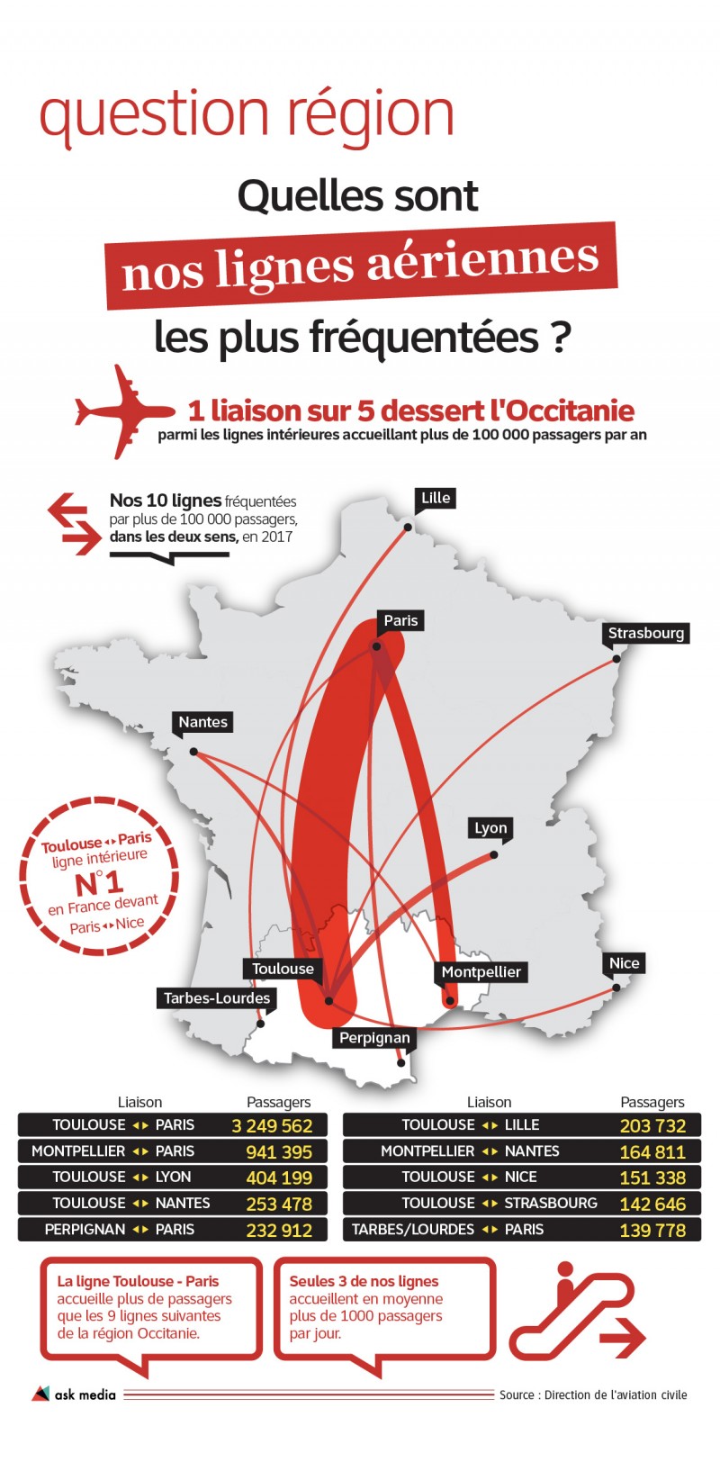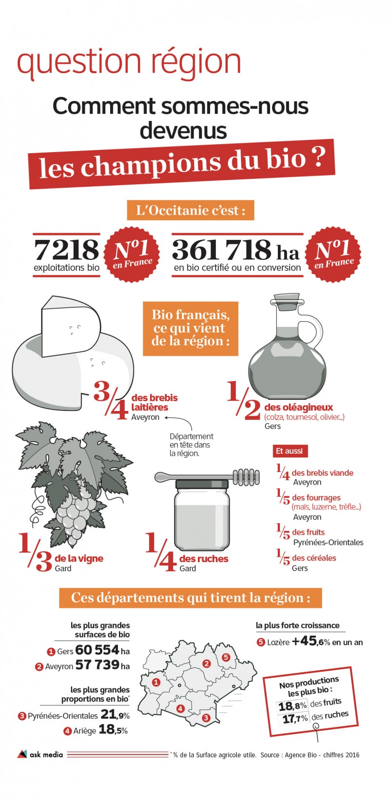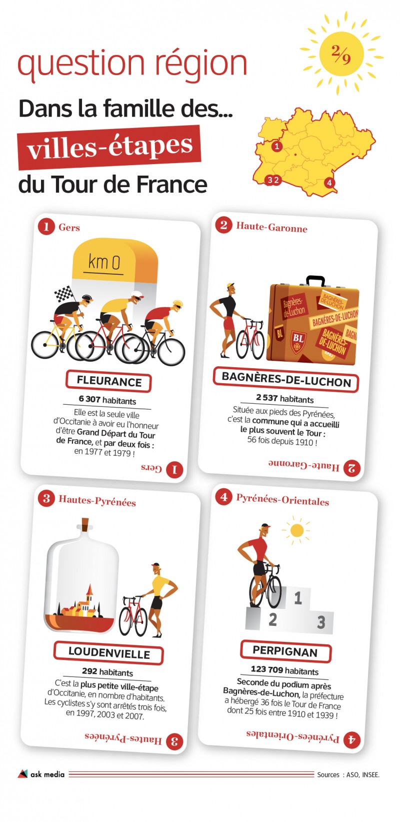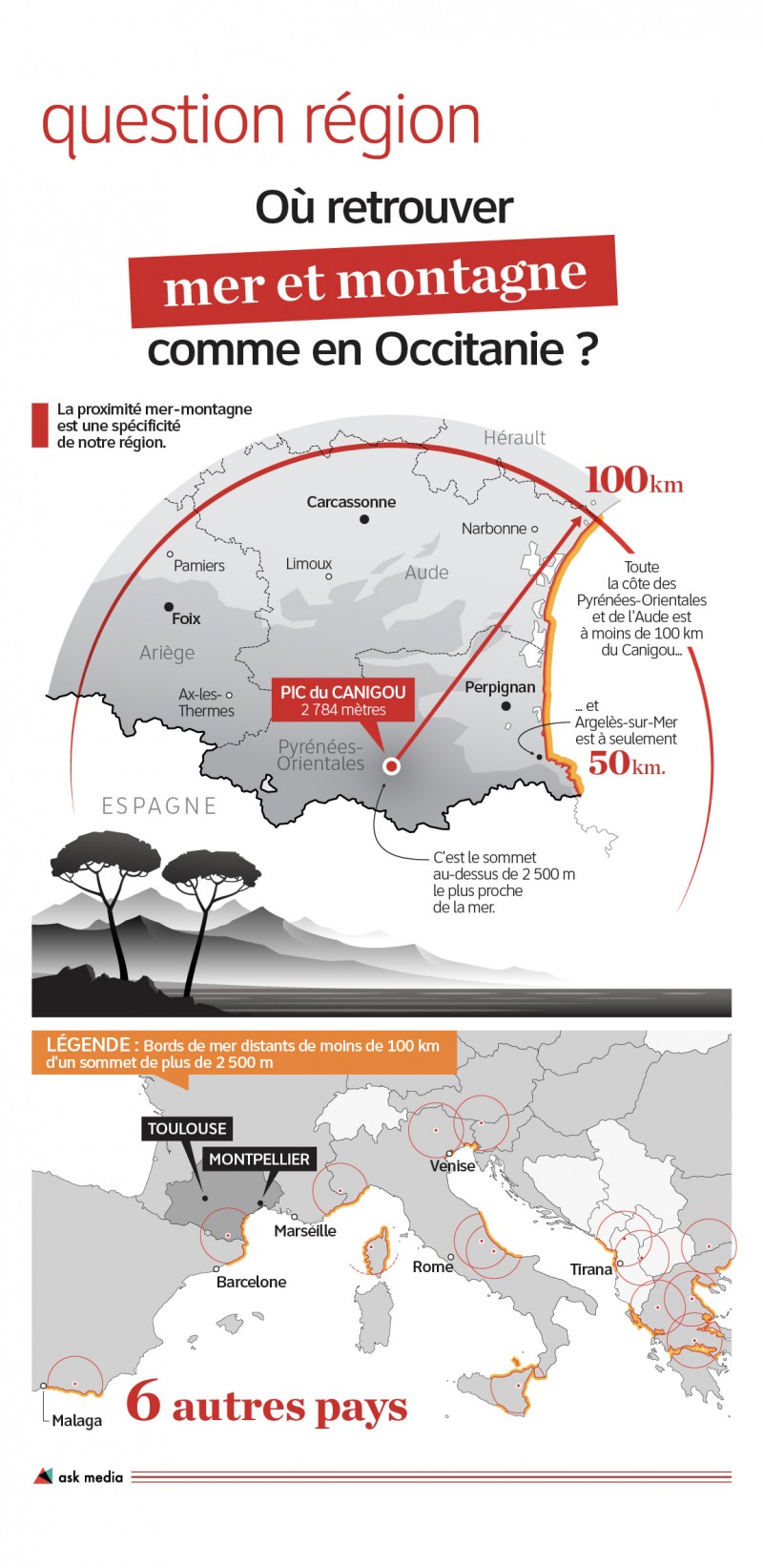 Imaginée par Ask Media dans le cadre plus large de la conception du supplément week-end des journaux Midi Libre et la Dépêche du Midi, cette rubrique d’infographie vise à faire ressortir les bons résultats de la région Occitanie dans un domaine, ou les éléments constitutifs de son identité, traités de manière graphique.
